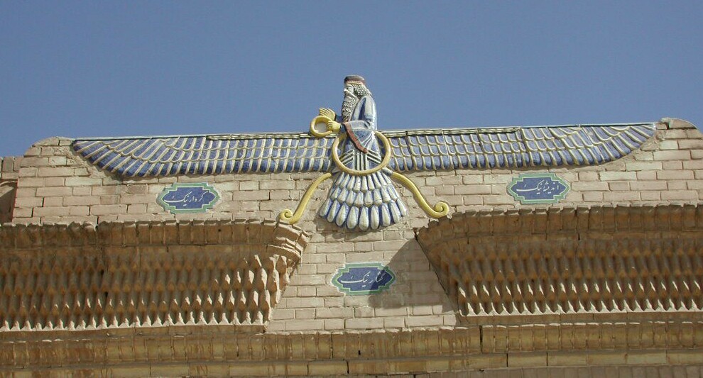 Au-dessus de la porte d’entrée du temple du feu, est placée une image en faïence bleue et jaune, représentant un grand disque ailé d’où émerge un buste d’homme tenant une couronne. C’est la figure d’Ahura Mazda qu’on rencontre partout en Iran. L’image d’Ahura Mazda planant dans l’azur apparaît omniprésente. On la voit aussi bien dans les grandes tombes, comme celle d’Artaxerxès, que sur les reliefs commémoratifs de Bisutun  et de Persépolis (escaliers sud le l’Apadan, porte est du nipylon, salle des cent colonnes ). Sous l’effigie d’Ahura Mazda, sont gravés en farsi, les trois préceptes du Zoroastrisme: Bien penser, bien parler, bien agir.