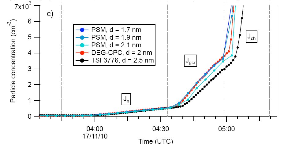 Il indique clairement comment les rayons cosmiques favorisent la formation d’amas de molécules (particules) qui peuvent se développer dans l’atmosphère réelle et ensemencer les nuages. Au cours d’une expérience matinale démarrée à 03h45 au CERN, la lumière ultraviolette commença à provoquer la formation de molécules d’acide sulfurique dans la chambre, tandis qu’un fort champ électrique débarrassait l’air des ions. Cela tendait aussi à débarrasser l’air des amas moléculaires générés dans l’environnement neutre (n) mais certains de ces amas s’accumulaient lentement. Aussitôt qu’on coupa le champ électrique à 04h33, des rayons cosmiques naturels (gcr) qui se sont mis à pleuvoir du plafond de la chambre expérimentale du CERN à Genève ont contribué à former des amas moléculaires à un rythme beaucoup plus rapide. Comment est-on sûr de cette contribution des rayons cosmiques? Parce qu’à 04h58, CLOUD a simulé un flux plus élevé de rayons cosmiques à l’aide d’émission d’un flux de particules pioniques chargées à partir de l’accélérateur, et le rythme de production des amas de particules s’est alors accéléré. Les différentes couleurs se réfèrent à des amas de différents diamètres (en nanomètres) enregistrés par divers instruments. Les amas les plus gros (en noir) ont pris plus de temps à se former que les petits (en bleu).