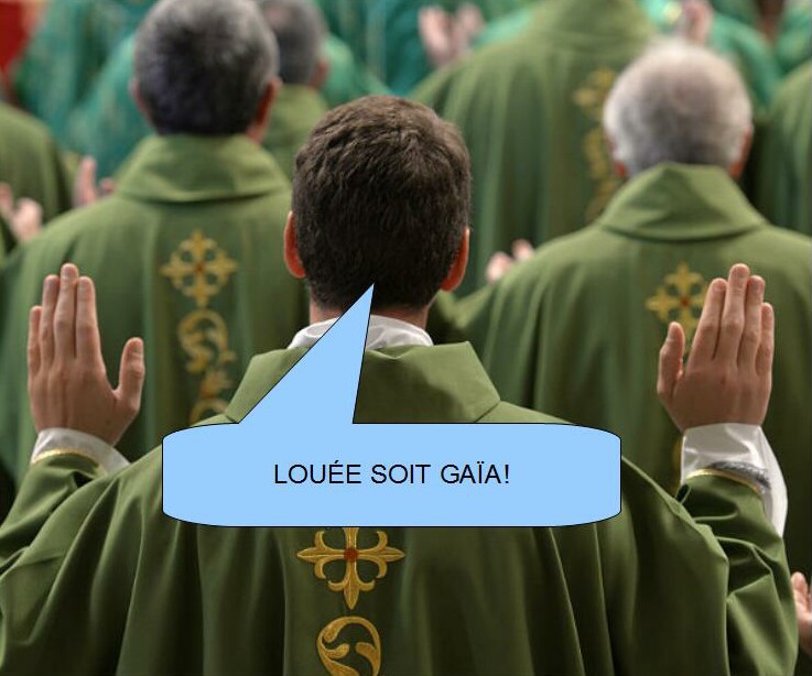 « Heureux les pauvres en esprit, car le royaume des cieux est à eux! » L’Église du pape François est fidèle à l’Évangile. Les représentants de l’Église catholique romaine du monde entier ont procédé à un ultime appel urbi et orbi lundi dernier à la conférence de l’ONU sur le climat , la COP21, qui s’ouvrira bientôt à Paris. Ces nobles cardinaux, évêques et prélats se sont ligués au Vatican, afin d’utiliser le réchauffement climatique anthropique (RCA) pour tenter de corriger les injustices dans le monde. Car il est évident que les nuées de locustes qui dévastent à chaque année les champs de millet, de manioc et de sorgho d’Afrique sont un effet direct des émissions de gaz à effet de serre (GES) des pays capitalistes. Tout comme les moussons, inondations et sécheresses qui accablent plusieurs pays. Quelle façon élégante de « redistribuer la richesse » ! Ces grands prêtres du climat sont aussi fidèles à l’esprit du concile Vatican II qui encourage l’oecuménisme, ici le rapprochement entre les Églises verte et catholique.