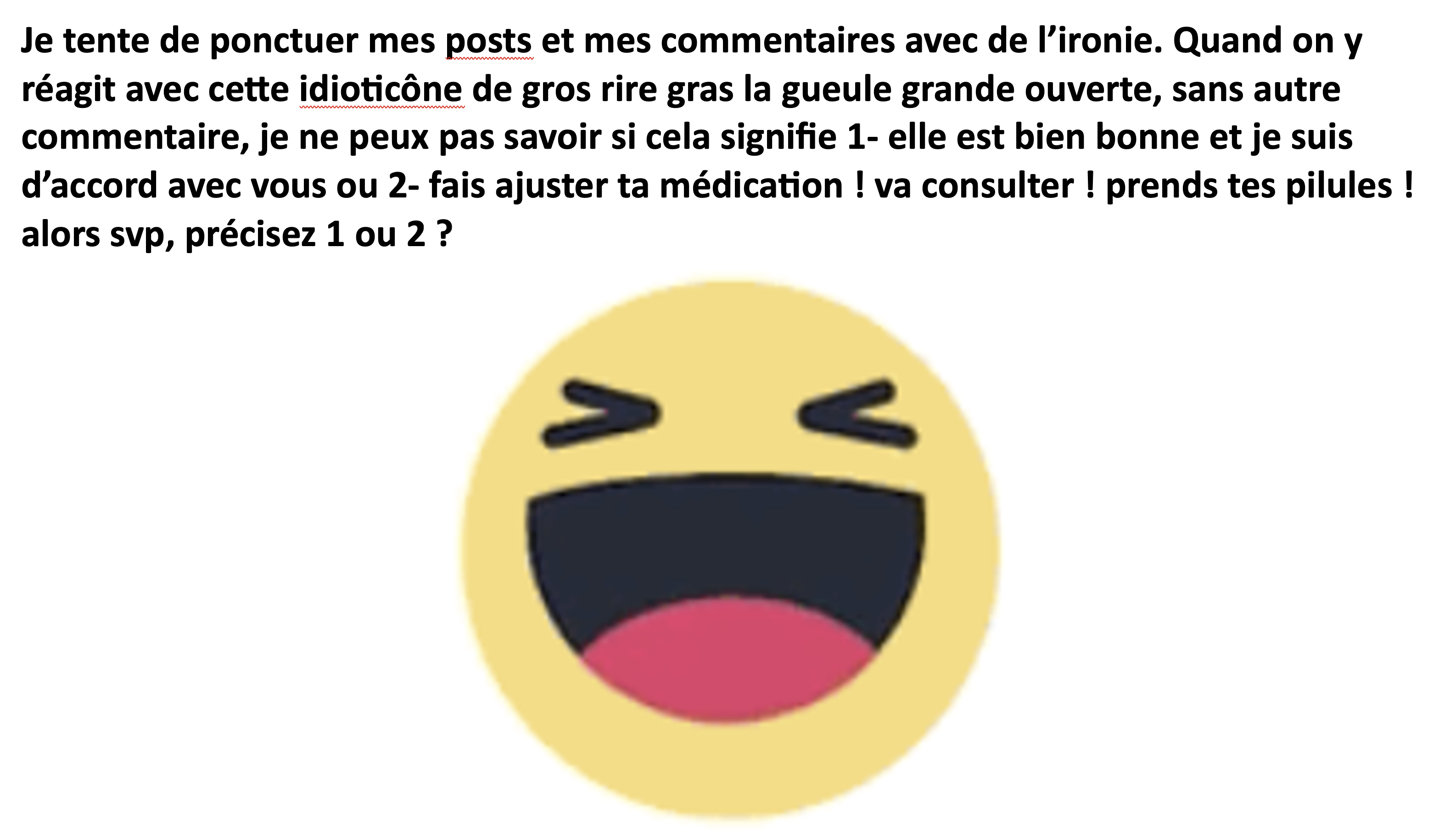 Sur les réseaux sociaux, j’essaie d’imprégner mes commentaires d’ironie, voire de sarcasmes. J’obtiens alors des réactions iconiques de pouces vers le haut, vers le bas, des petits cœurs, des smileys, ou le pire de tous, le gros rire gras à gorge déployée. Ce dernier me pose un problème, car il est ambigu. Est-ce « j’approuve et elle est bien bonne ! » ou « t’es complètement à côté de la plaque ! … fais ajuster ta médication… va consulter… prends tes pilules… » ? Le langage des émoticônes est donc très pauvre, rustre et grossier, très peu nuancé. Je dirais qu’il est presque binaire.
